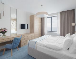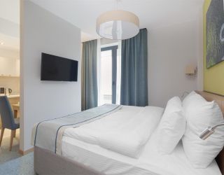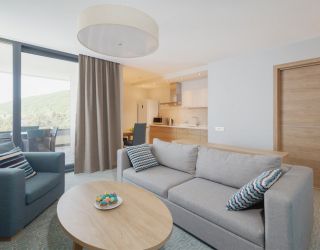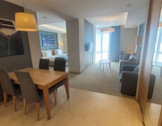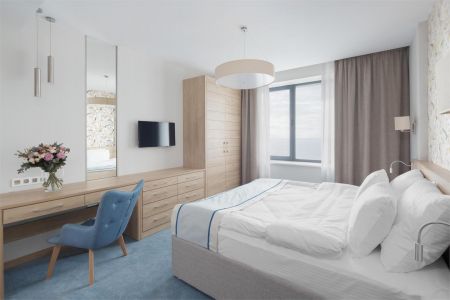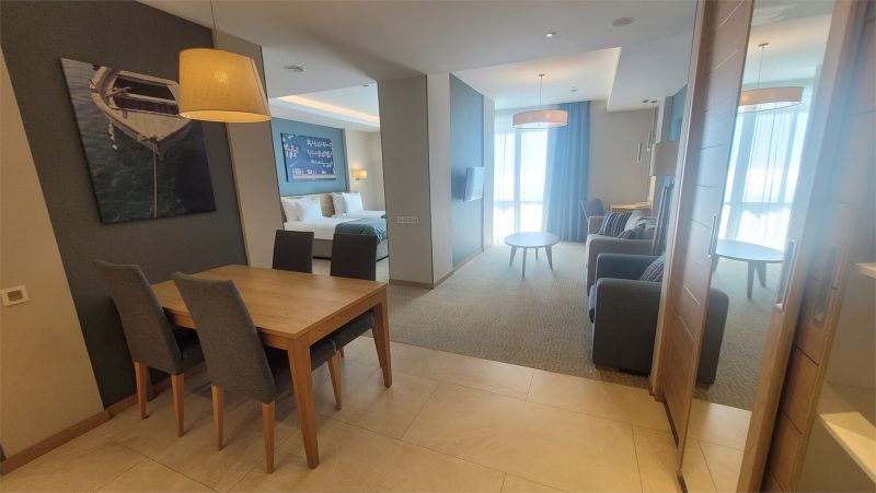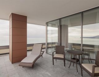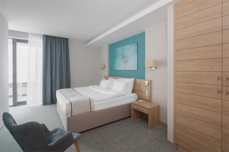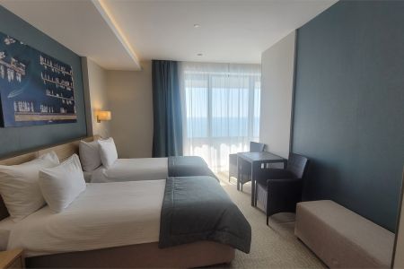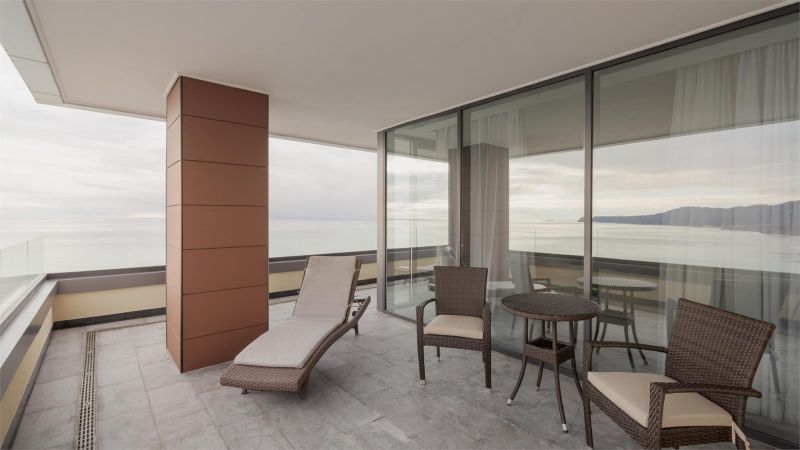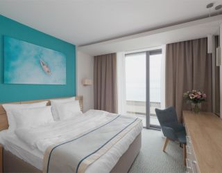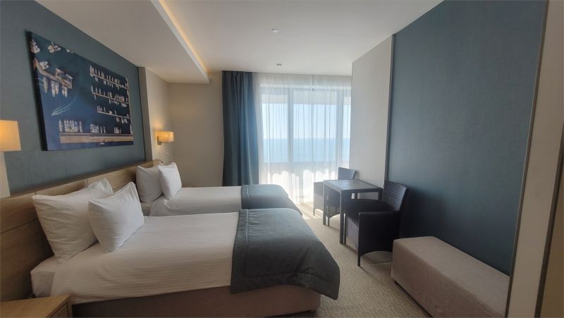 В отеле представлено 72 просторных номера, занимающих большую площадь. С балкона открывается захватывающий вид на бескрайние просторы Черного моря. Номера разместились в уютном 10-этажном корпусе с лифтом. Интерьер комнат современный, выполнен в светлых оттенках. В них предусмотрена необходимая мебель, телевизор со спутниковыми каналами, кондиционер, чайная станция, микроволновая печь, холодильник, гладильные принадлежности. Санузел с душевой. Гостям предоставляются мягкие полотенца и халаты, тапочки, туалетно-косметические принадлежности, а также фен.